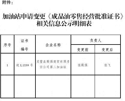 关于灵璧县殿强商贸有限责任公司第二加油站申请变更成品油零售经营批准证书负责人有关情况的公示