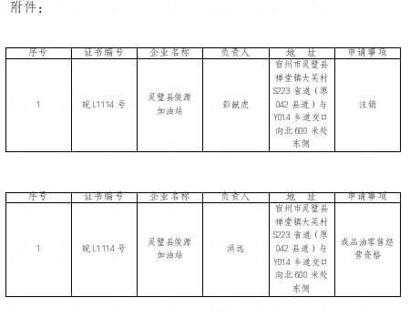 关于注销灵璧县俊源加油站成品油零售经营资格并重新申领新成品油零售经营资格有关情况的公示