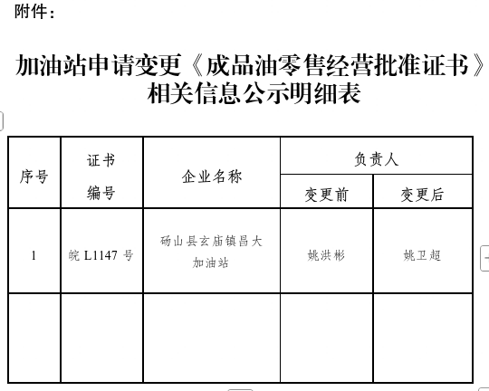 关于砀山县玄庙镇昌大加油站申请变更成品油零售经营批准证书负责人有关情况的公示