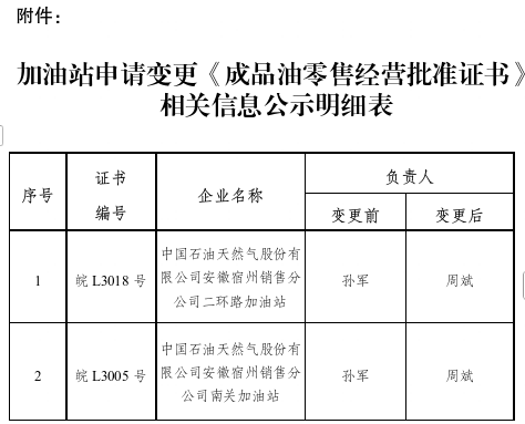 为进一步推进效能建设,实行政务公开,现对宿州市经济开发区经济与科技局上报的《关于中国石油天然气股份有限公司安徽宿州销售分公司2家加油站变更成品油零售经营批准证书的请示》(宿开经〔2025〕35号)有关事项进行公示,公示时间2026年1月5日至2026年1月9日(内容见附件)。