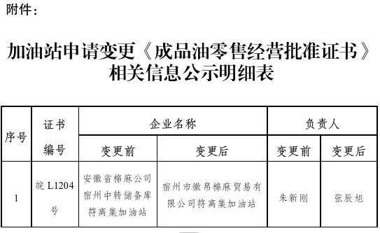关于宿州市徽帛棉麻贸易有限公司符离集加油站申请变更成品油零售经营批准证书相关信息的公示