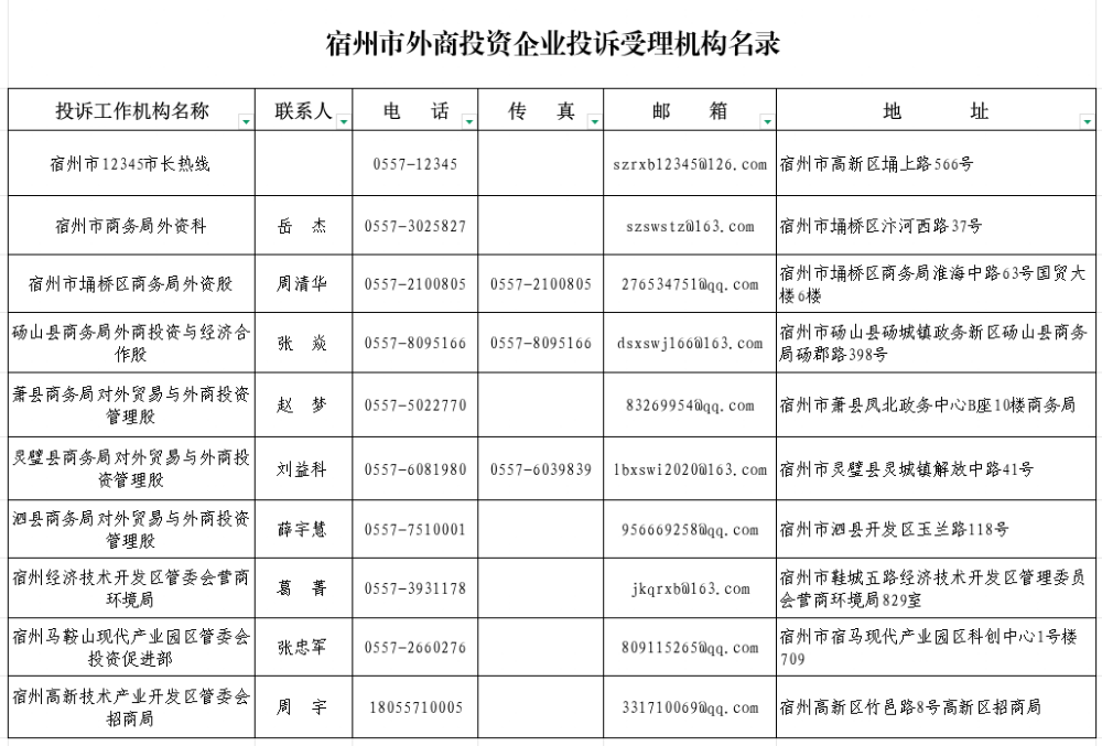 宿州市外商投资企业投诉受理机构名录